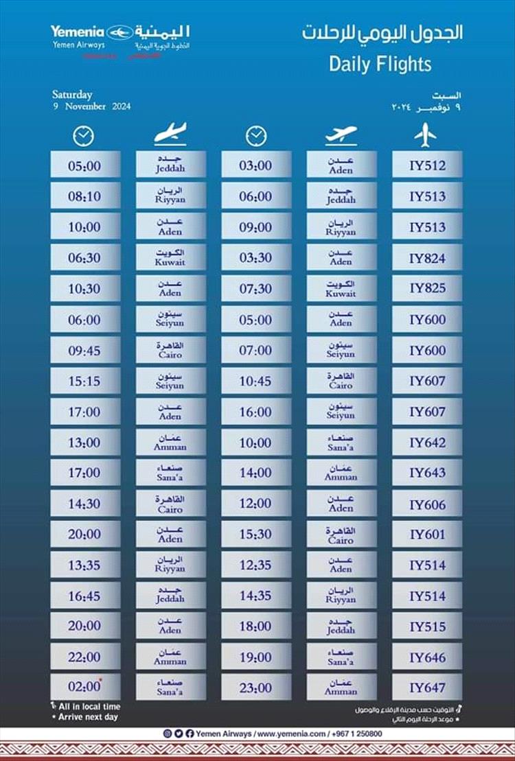 مواعيد اقلاع رحلات طيران اليمنية لليوم السبت كالتالي: