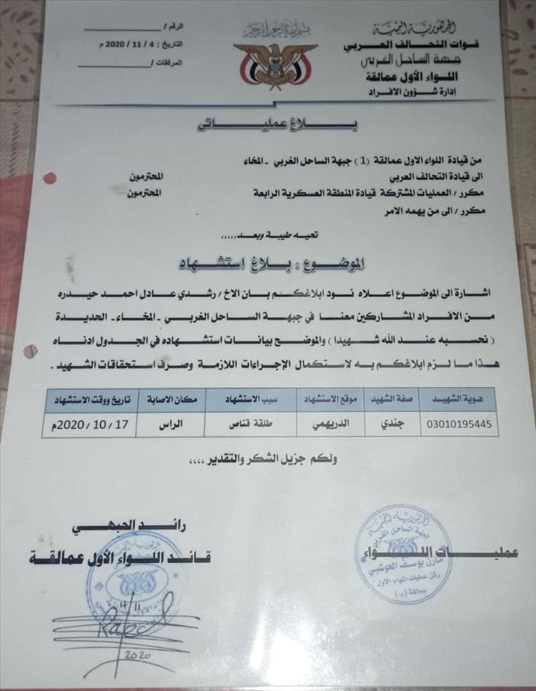 وأكد عادل احمد والد الشهيد إنه سبق وأن تقدم بالعديد من المطالبات لقيادة المنطقة العسكرية الرابعة لتحويل راتب نجله إلى المصارف ضمن كشوفات الشهداء والجرحى لكنه دون جدوى.