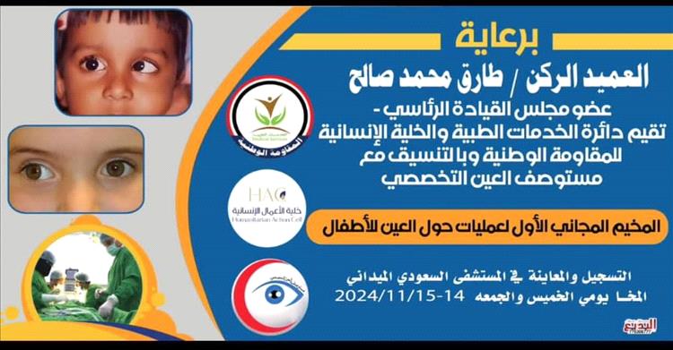 ويقام المخيم الذي يجري بالتنسيق مع مستوصف العين التخصصي، في المستشفى السعودي الميداني بالمخا خلال يومي غدا الخميس وبعد غد الجمعة.