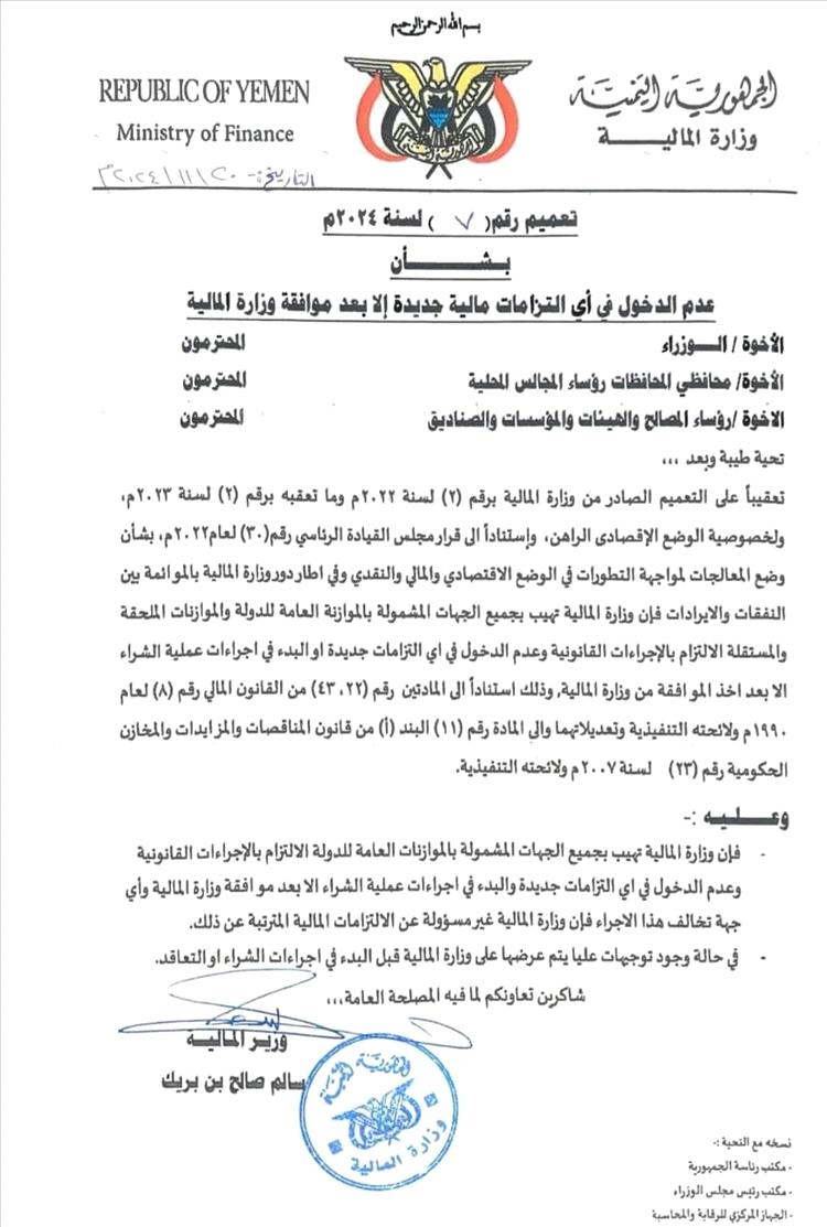 اصدر معالي وزير المالية الاستاذ سالم صالح بن بريك تعميم رقم ( 7 ) لسنة ٢٠٢٤م بشأن عدم الدخول في أي التزامات مالية جديدة إلا بعد موافقة وزارة المالية.