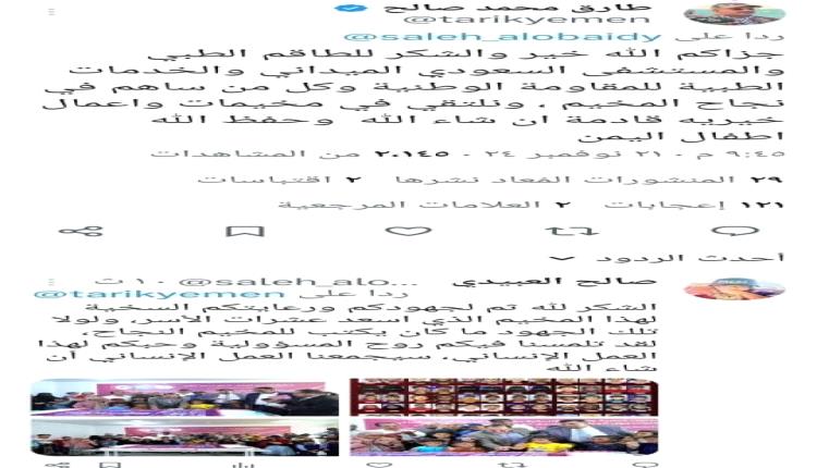 وقال العميد طارق في تغريدة له على تويتر معلقا على منشور للزميل صالح العبيدي رصده محرر موقع منبر الاخبار جزاكم الله خير والشكر للطاقم الطبي والمستشفى السعودي الميداني والخدمات الطبية للمقاومة الوطنية وكل من ساهم في نجاح المخيم.