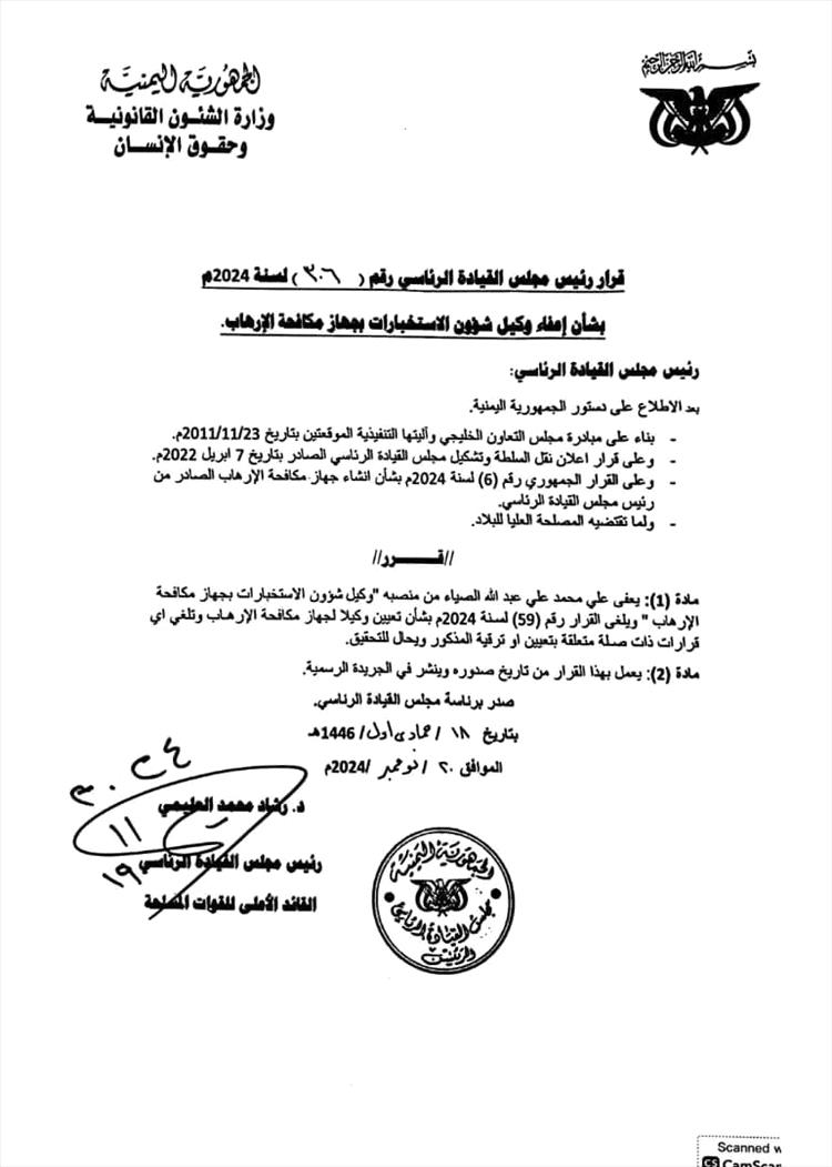 وكان رئيس مجلس القيادة الرئاسي د.رشاد العليمي ، قرار ٣٠٦ بتاريخ ١٩ نوفمبر ٢٠٢٤ قضى بموجبه بإعفاء علي محمد علي عبدالله الصياء كوكيل شؤون الاستخبارات بجهاز مكافحة الارهاب.