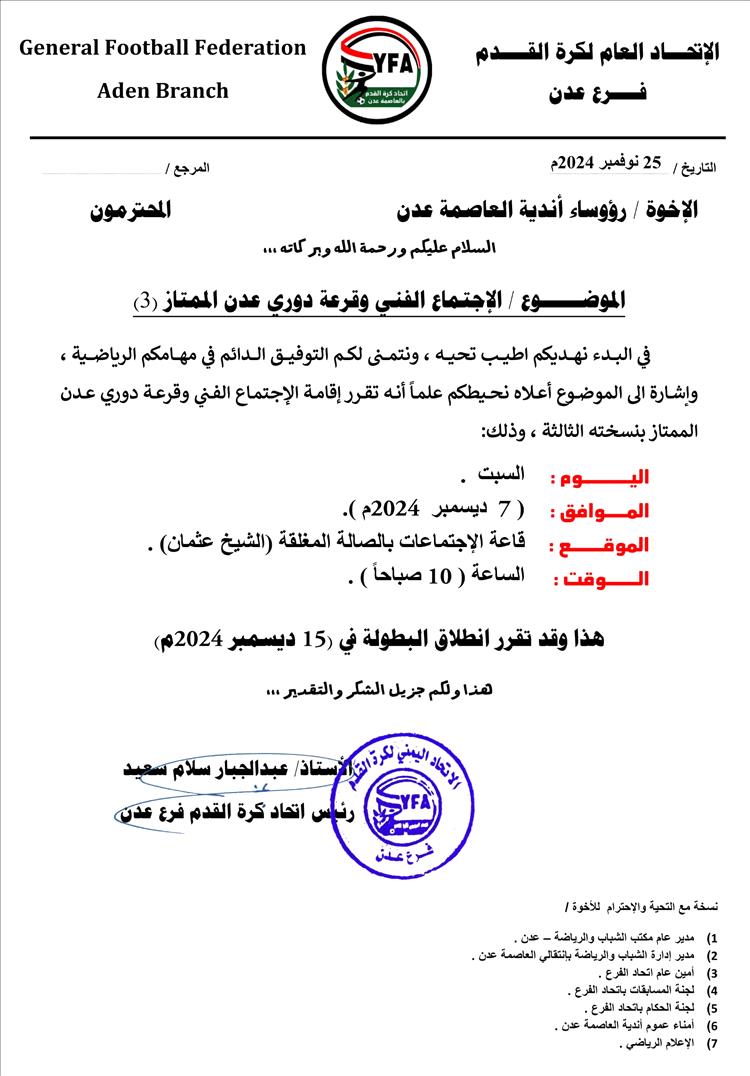 كما أعلن الاتحاد عن موعد الاجتماع الفني وقرعة النسخة الثالثة من دوري عدن الممتاز، والذي سيُعقد صباح يوم السبت الموافق 7 ديسمبر 2024م، في قاعة الاجتماعات بالصالة المغلقة في الشيخ عثمان.