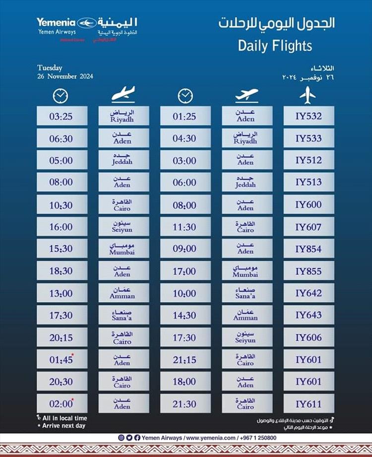 مواعيد اقلاع رحلات طيران اليمنية لليوم الثلاثاء كالتالي: