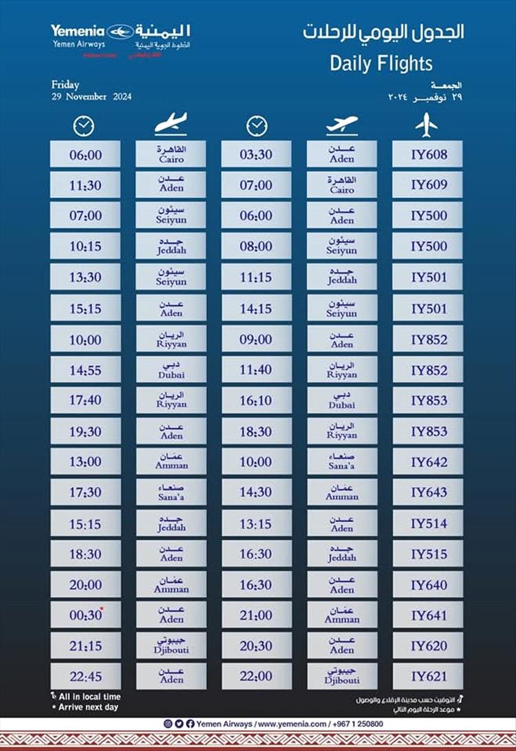 جدول مواعيد اقلاع رحلات طيران اليمنية لليوم الجمعة