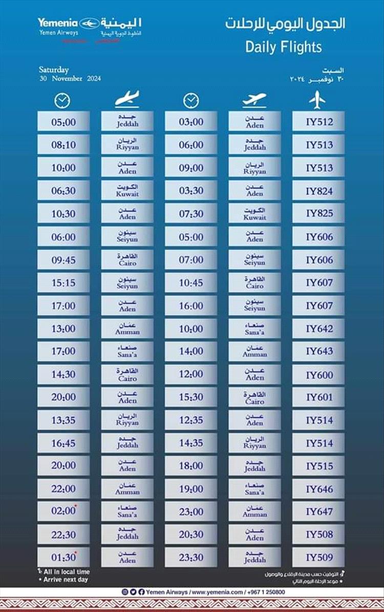 مواعيد اقلاع رحلات طيران اليمنية لليوم السبت كالتالي: