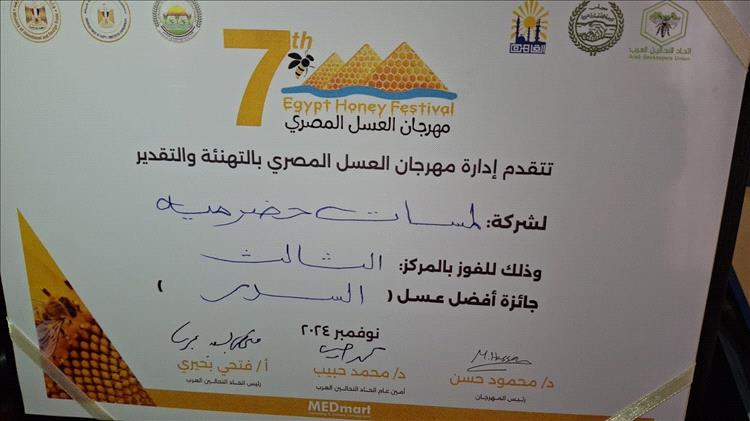 حصد متجر وسوبر ماركت "لمسات حضرمية"، للعطارة والبُن والعسل اليمني، جائزة المركز الثالث في مهرجان العسل السابع، الذي اختتمت فعالياته يوم السبت، بالعاصمة المصرية القاهرة.