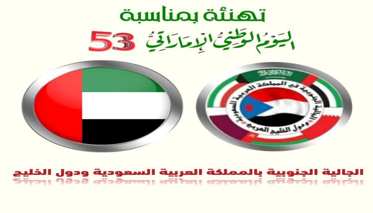 تتقدم الجالية الجنوبية في المملكة العربية السعودية ودول الخليج العربي، بأسمى آيات التهاني والتبريكات لحكام وشعب دولة الإمارات العربية المتحدة الشقيقه بمناسبة العيد الوطني ال 53 لاتحاد دولة الإمارات العربية المتحدة.