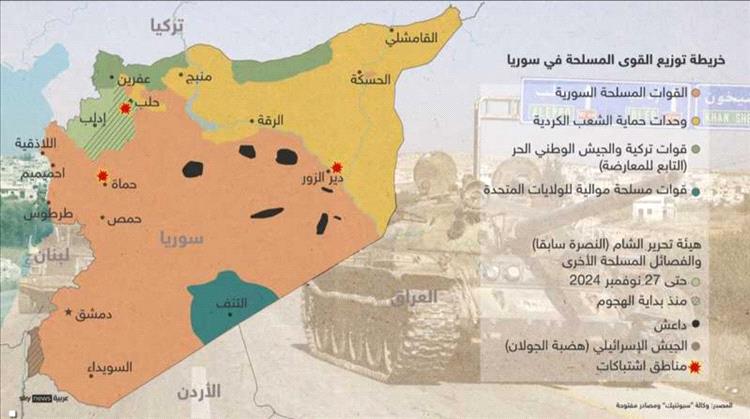 الخريطة المرفقة (الغرافيك) تمثل مناطق سيطرة القوى المختلفة في سوريا، حيث تسيطر القوات الحكومية على أكثر من 60 في المئة من الأرض، بينما تسيطر قوات سوريا الديمقراطية على نسبة لا بأس بها من الأراضي، خصوصا منطقة الجزيرة، شرقي نهر الفرات.
