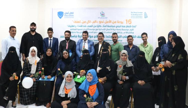 تحت شعار معا لنبني مجتمعا آمنا، خاليا من العنف ضد النساء والفتيات نظمت اليوم في العاصمة عدن مؤسسة بصمة حياة للأعمال الإنسانية مع مؤسسة أرمان لتنمية المجتمع و بالشراكة مع تكتل أمان لمنضمات المجتمع المدني ندوة تدريبية بعنوان