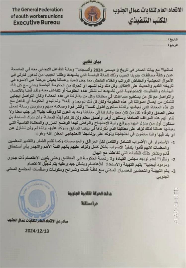 تماشيا مع بياننا الصادر في تاريخ 3 ديسمبر 2024 وانسجاما وحالة التفاعل الايجابي معه في العاصمة عدن وكافة محافظات جنوبنا الحبيب وذلك للحالة البائسة التي يشهدها وطننا الحبيب من تدهور كارثي في الأحوال المعيشية وانخفاض الرواتب والغلاء الفاحش مما جعل شعبنا وعمالنا يعيش مرحلة هي الاسوء في تاريخه القديم والحديث على الاطلاق وكل ذلك ولم تشهد أي تحرك من الحكومة البائسة وحتى مع كل تلك البيانات والفعاليات الاحتجاجية التي تشهدها لم تتأثر هذه الحكومة أو تتفاعل معه ولقد قمنا بالاتصال والتواصل مع كل من يستطيع مساعدتنا في معاناتنا وكل من يشاركنا في هذه المعاناة وكان التواصل ايجابي لنتمكن من إيصال أصواتنا إلى هذه الحكومة ولكن كل ذلك لم يجدي نفعا ولم تبدي الحكومة أي تفاعل مع كل هذه المعاناة التي نعيشها ولكننا سنكون أطول نفسا وأكثر قوة وصلابه منهم وسنرسل رسالة تحمل معنى الصدق والوفاء لكل من كان معنا وشاركنا في معاناتنا ومد يد العون لنا ووقف جنبا إلى جنب معنا ولا تنكر لهم هذه المواقف الصادقة وسنكون أرقى وأصدق معكم ولن نترككم لهذه المعاناة ولن نترك الساحة بل سنكون أول من ينزل إليها ويرفع راية الاحتجاج والرفض لهذا الوضع المزري والمعاناة القاسية التي يعيشها عمالنا لذلك نؤكد على مطالبنا الذي ذكرناها في بياننا السابق ونؤكد عليها واننا لم ولن تتنازل عن اي بند فيها واننا ماضون في احتجاجنا ونؤكد على برنامجنا الاحتجاجي المعلن عنه وهو :
