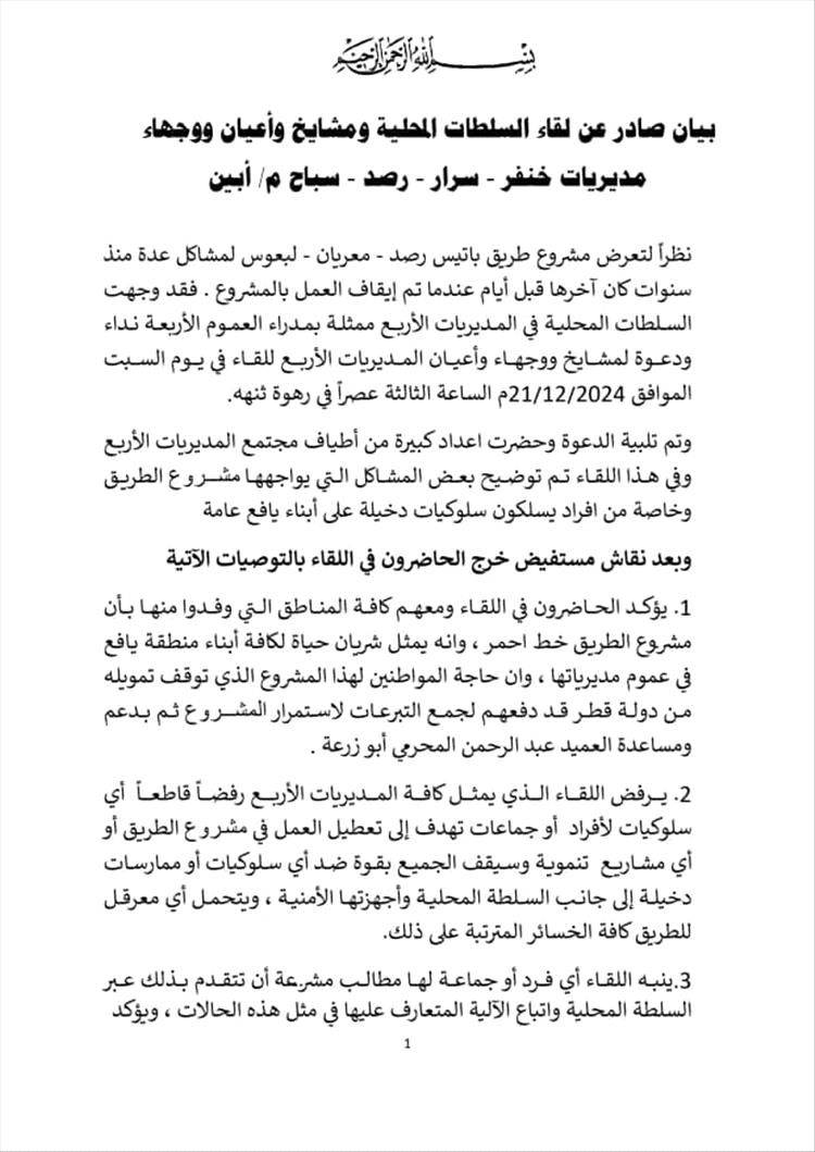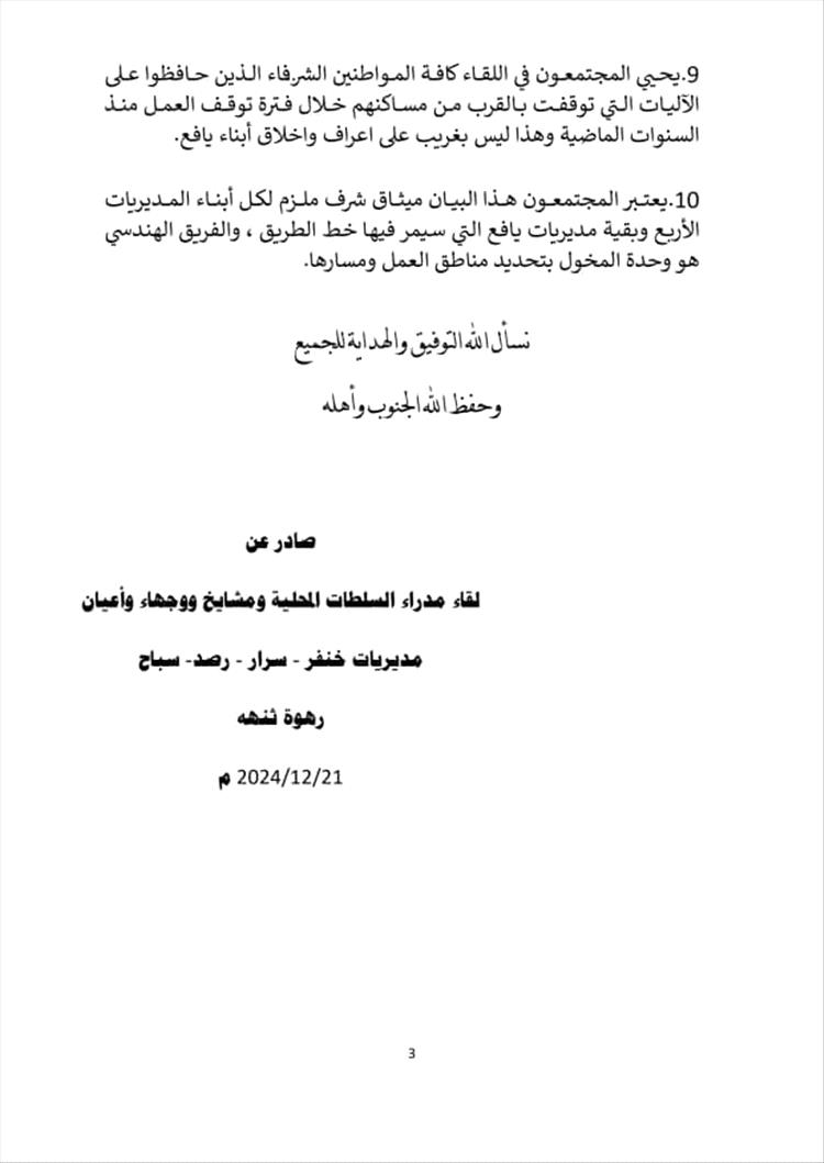 صادر عن لقاء مدراء السلطات المحلية ومشايخ ووجهاء وأعيان مديريات خنفر - سرار - رصد - سباح رهوة ثنهه2024/12/21م