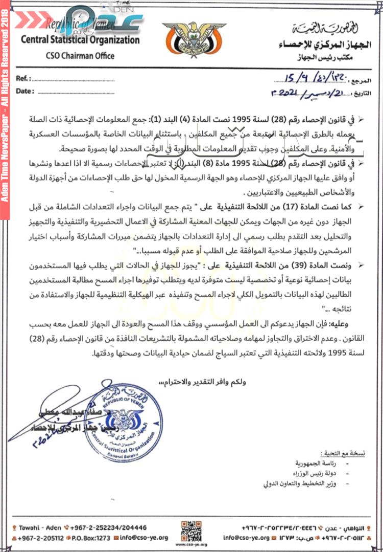 ودعت رئيس الجهاز المركزي للإحصاء الى العمل المؤسسي ووقف هذا المسح والعودة إلى الجهاز والعمل معه بحسب القانون وعدم الاختراق وتجاوز مهام وصلاحيات الجهاز المشمولة بالتشريعات النافذة من قانون الاحصاء رقم 28 لسنة 1995م ولائحته التنفيذية.