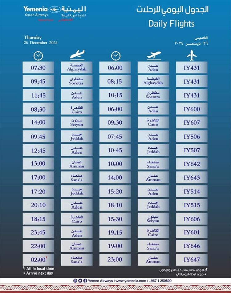 جدول مواعيد اقلاع رحلات طيران اليمنية لليوم الخميس