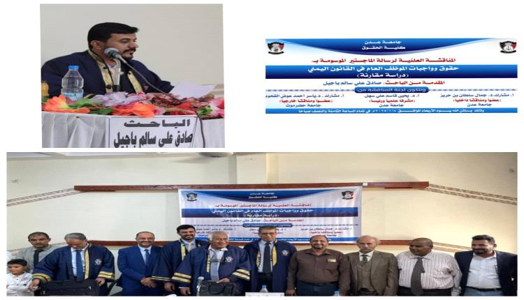 بمناسبة نيله درجة الماجستير بامتياز من كلية الحقوق بجامعة عدن والتي نالها بعد مناقشته العلنية لرسالة الماجستير الموسومة ب(حقوق وواجبات الموظف العام في القانون اليمني - دراسة مقارنة ) .. سائلين المولى عز وجل أن يوفقه ويسدد خطاه ، ومتمنين له الرقي ونيل الدرجات العلمية العليا ..