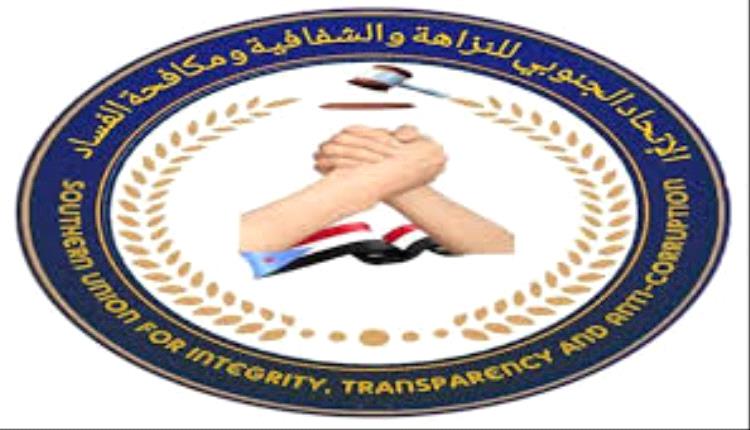 بلاغ صحفي صادر عن الاتحاد الجنوبي للنزاهة والشفافية ومكافحة الفساد : "يؤكد الاتحاد الجنوبي للنزاهة والشفافية ومكافحة الفساد استمراره تماشياً مع الخطط والبرامج الحالية والمستقبلية في مكافحته للفساد وكشف مواطنه واخطبوطاته والعمل تجميع كافة المعلومات والوثائق التي تعد أدلة دامغة على وجوده وأماكن تواجده في كل المؤسسات والمرافق الحكومية والمدنية الإيرادية والخدماتية والتنموية وفي كافة المؤسسات العامة والخاصة ، والتي يعود ضرر هذا الفساد المستشري في اروقتها على الوطن بصورة عامة والمواطن بصورة خاصة.