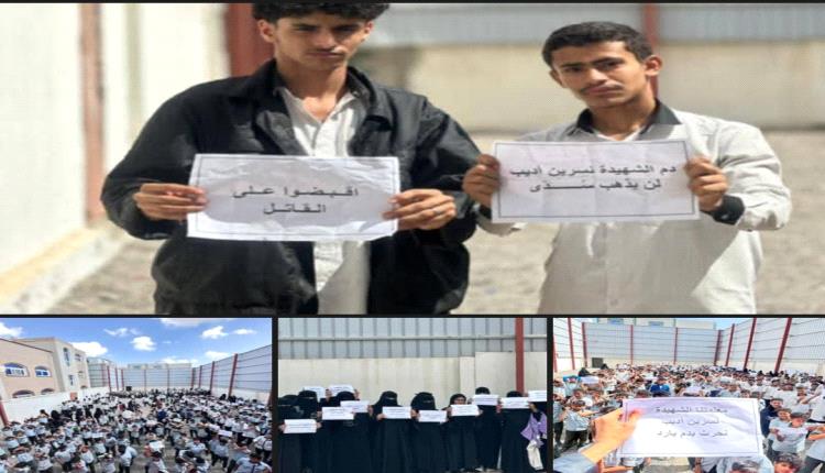 رفع طلاب الشهيدة "نسرين" لافتات تطالب الأجهزة الأمنية في العاصمة عدن بالقبض على زوجها المتهم بقتلها، مؤكدين ضرورة إنزال أقسى العقوبات بحقه ليكون عبرة لكل من يعتدي على حياة الآخرين.