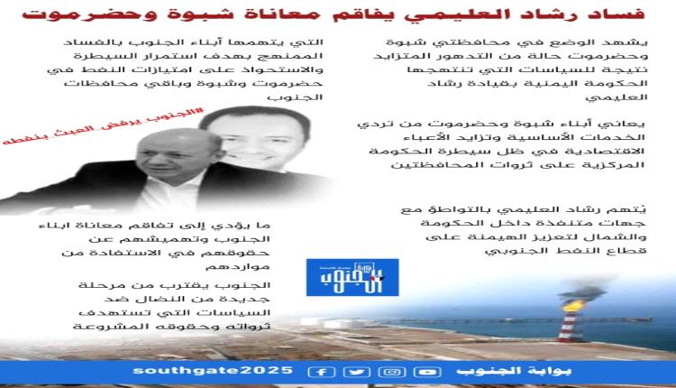 وأكدوا على أن الوضع الذي تعاني منه شبوة وحضرموت جراء فساد رشاد العليمي، هدفه الاستمرار في السيطرة والاستحواذ على امتيازات النفط في حضرموت وشبوة وسائر محافظات الجنوب. كاشفين كيفية استيلاء لوبي الفساد اليمني الشمالي على قطاعات النفط في حضرموت وشبوة، وذلك من خلال استغلاله فقدان الدولة للجاهزية الفنية والقانونية والمؤسساتية من خلال مافيا الفساد اليمني الشمالي. مشيرين على أن حرب الخدمات في العاصمة الجنوبية عدن وباقي محافظات الجنوب هي وسيلة من وسائل رشاد العليمي واتباعه بهدف إخضاع الجنوب وشعبه لصالح الاجندات اليمنية.
