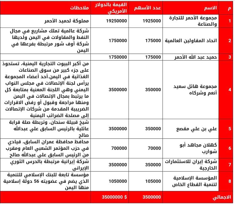 المساهمون في شركة سبأ فون :"شركة إيران للاستثمارات الخارجية، المملوكة للحرس الثوري الإيراني، مجموعة هائل سعيد أنعم، وزعماء قبائل يمنية موالية لعلي عبدالله صالح"؛ مصدر هذه المعلومات تحقيق استقصائي لشبكة إريج.