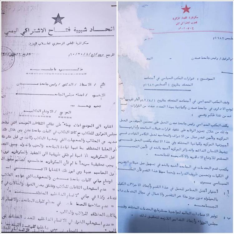 -يكلف المكتب السياسي رئيس جامعة عدن بالتنسيق مع لجنة الكادر بسكرتارية اللجنة المركزية والدائرة الأيديولوجية بالعمل على تعيين كوادر حزبيه فـي الشواغر القيادية في الجامعة وفي نفس الوقت العناية بالكادر غير الحزبي المؤهل علميا وسياسيا والاستفادة منه في هذا المجال. وبهذا الصدد يقـر المكتب السياسي التعيينات المقترحة من قبل رئيس الجامعة في الشواغر القيادية في الجامعة وكلياتها ويؤكد في نفس الوقت على أن تبذل الجهود من أجـل العناية بالكادر المؤهل علميا وسياسيا".