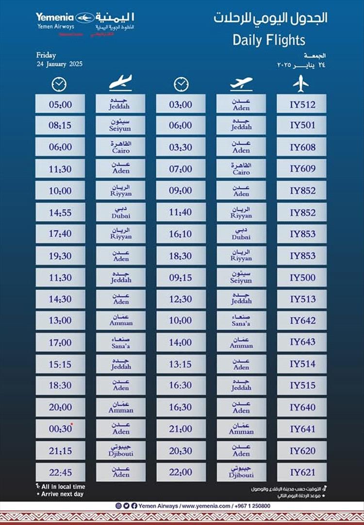 جدول مواعيد اقلاع رحلات طيران اليمنية ليوم غد الجمعة