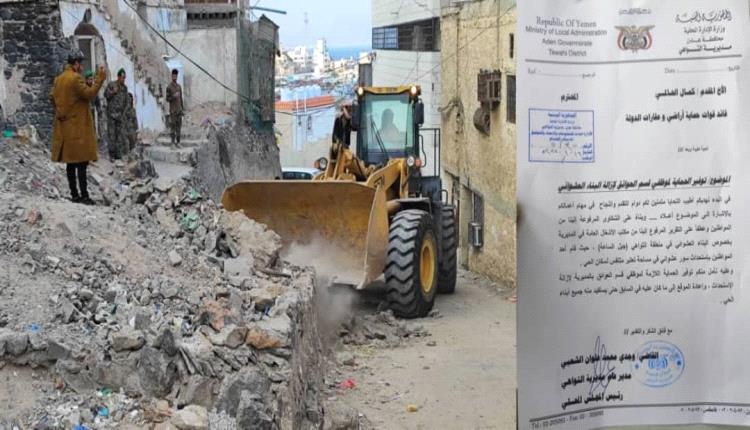 نفذت وحدة حماية الأراضي صباح اليوم الأحد نزول حماية مع اشغال مديرية التواهي بعدن لإزالة بناء عشوائي مستحدث.