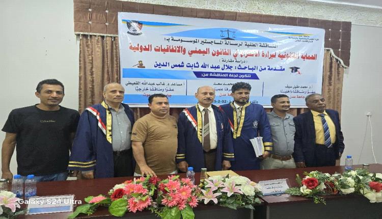 نال الباحث جلال عبدالله ثابت شمس الدين درجة الماجستير من جامعة عدن - كلية العلوم الاجتماعية والإنسانية - قسم القانون الخاص، عن رسالته العلمية الموسومة بـ "الحماية القانونية لبراءة الاختراع في القانون اليمني والاتفاقيات الدولية (دراسة مقارنة)".