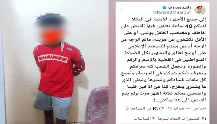 ويناشد المواطنين في المكلا الأمن بالتحرك للقبض على مرتكبي الجرائم المماثلة لتحقيق العدالة وجبر قلوب المكلومين من افعال الذئاب البشرية