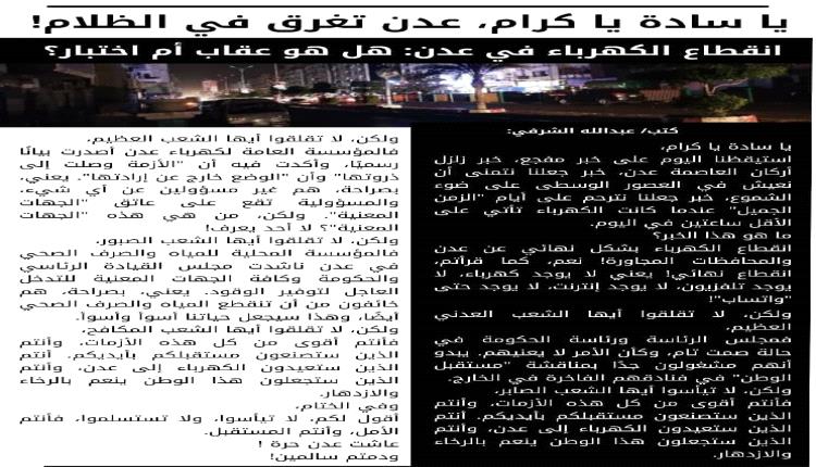 فأنتم أقوى من كل هذه الأزمات، وأنتم الذين ستصنعون مستقبلكم بأيديكم. أنتم الذين ستعيدون الكهرباء إلى عدن، وأنتم الذين ستجعلون هذا الوطن ينعم بالرخاء والازدهار.