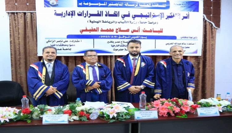 أبارك و أهنئ الصديق و الزميل العزيز / أنس صلاح العفيفي بمناسبة حصوله على درجة الماجستير عن رسالته بعنوان "أثر التفكير الاستراتيجي في اتخاذ القرارات الإدارية لدى وزارة الشباب والرياضة" من جامعة عدن.