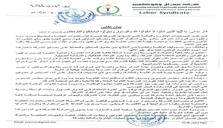 في ظل المستجدات الإدارية والمالية التي تشهدها الشركة اليمنية للاستثمارات النفطية والمعدنية(عدن)، وما رافقها من قرارات ذات أثر مباشر على استقرار الشركة ومصالح العاملين فيها، تتابع النقابة بقلق بالغ التطورات الأخيرة التي تتطلب مراجعة دقيقة لضمان حماية حقوق الموظفين واستقرار الأداء المؤسسي للشركة وفقًا للقوانين النافذة