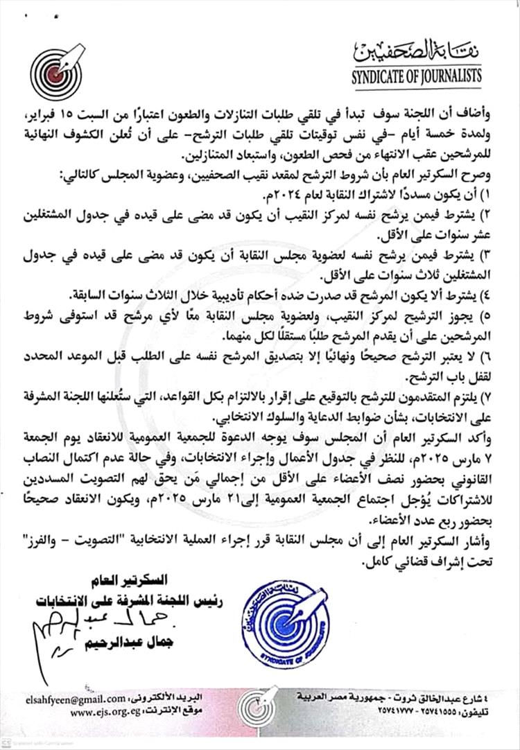 وأعلن جمال عبد الرحيم سكرتير عام النقابة، ورئيس اللجنة المشرفة على الانتخابات، أن اللجنة المُشكلة من أعضاء مجلس النقابة المستمرة عضويتهم، بمعاونة بعض أعضاء الجمعية العمومية تواصل صباح غدٍ الإثنين عملها في تلقي طلبات الترشح بقاعة أمين الرافعي في مبنى النقابة اعتبارًا من الساعة العاشرة صباحًا، وحتى الثالثة عصرًا، مشيرًا إلى أن اللجنة سوف تستمر في تلقي طلبات الترشح حتي الساعة الثانية عشرة ظهر الخميس المقبل 13 فبراير.