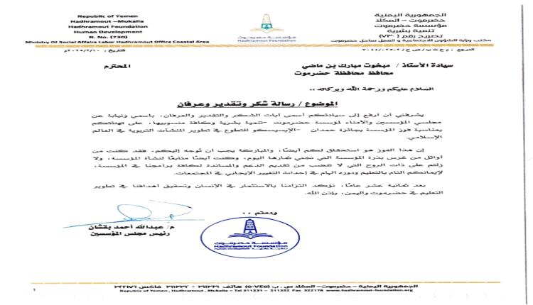 وجاء في رسالة رئيس مجلس مؤسسي مؤسسة حضرموت تنمية بشرية المهندس عبدالله بقشان "سيادة الأستاذ/ مبخوت مبارك بن ماضي