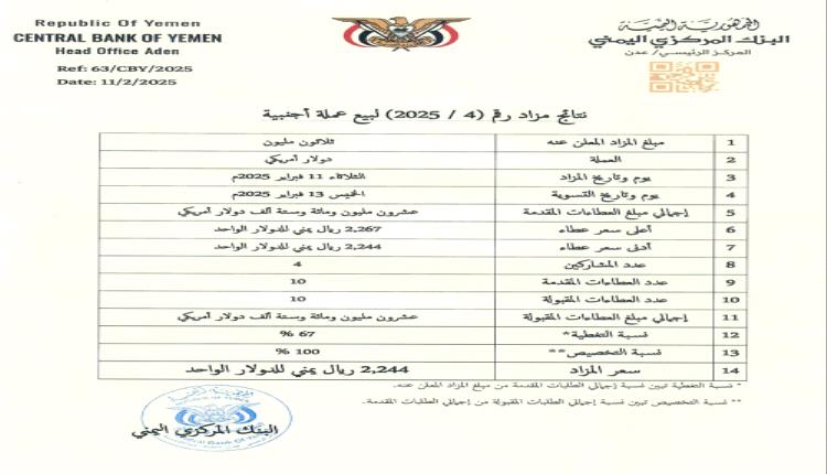 مرة أخرى، يواصل البنك المركزي في عدن سياسته النقدية المدمرة عبر مزادات بيع العملة الأجنبية، والتي أثبتت مرارا أنها تؤدي إلى نتائج عكسية على استقرار الريال اليمني. اليوم، الثلاثاء 11 فبراير، شهدنا انهيارا جديدا للعملة الوطنية عقب إعلان البنك عن أحد مزاداته حيث انخفض سعر صرف الريال اليمني امام الريال السعودي ليصبح ٦٢٠ ريالا يمنيا للريال السعودي الواحد ، وهو سيناريو مألوف يتكرر مع كل مزاد، دون أن تتخذ الجهات المعنية أي خطوات لتصحيح المسار.