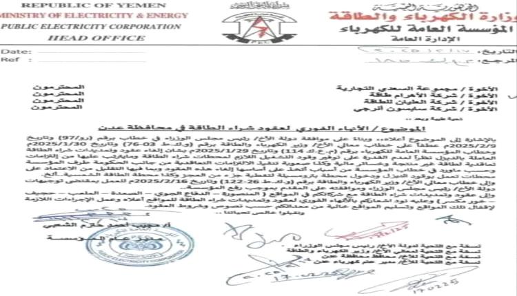 وصف كاتب سياسي وعضو في مجلس المستشارين الجنوبي "الانهاء الفوري لعقود شراء الطاقة في عدن" وصفه بقرار شجاع في الوقت المناسب".