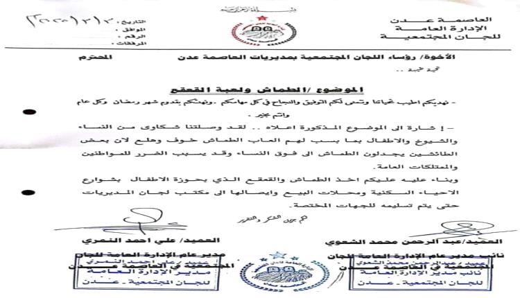وأشار التعميم، الموجه إلى رؤساء اللجان المجتمعية بمديريات العاصمة عدن، إلى أن هذه الألعاب تثير الخوف والذعر بين السكان، حيث يقوم بعض الأطفال بإطلاق الطماش فوق رؤوس النساء، مما يؤدي إلى الإضرار بالممتلكات العامة ويسبب إزعاجًا كبيرًا.