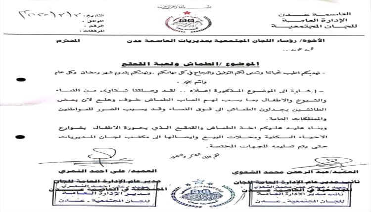 وبناء عليه عليكم اخذ الطماش والقعقع الذي بحوزة الاطفال بشوارع الاحياء السكنية ومحلات البيع وايصالها الى مكتب لجان المديريات حتى يتم تسليمه للجهات المختصة.