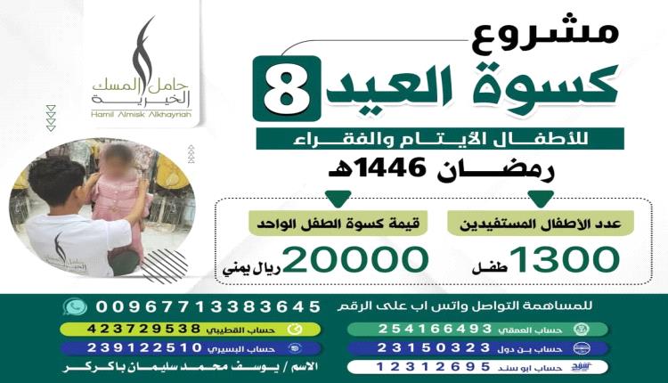 في بادرة إنسانية لمساعدة الآباء الذين يعجزون في مناسبات الأعياد عن شراء ملابس العيد، وكذا الأيتام الذين فقدوا معيلهم، ونحن نعيش في ظروف اقتصادية استثنائية يمر بها الوطن. وقد أكرم الله بعض مديريات محافظة شبوة بمبادرة شبابية خيرية بقيادة مسؤول المبادرة الشيخ يوسف باكركر أبو يعقوب حفظه الله وأعانه وفريقه المبارك، ومن خلفه أصحاب الصحائف المليئة بالخير والإحسان الذين يمدون يد العون وينفقون من حر أموالهم وجود إحسانهم.