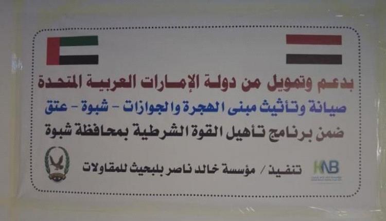 وهذا ما أكده مدير عام شرطة محافظة شبوة العميد الركن فؤاد النسي، من أنه تم" استهداف 34 مشروع في الشرطة بدعم من الإمارات العربية المتحدة، منها إنشاء وأخرى صيانة، وتدريب وتأهيل أفراد الشرطة بمختلف القطاعات".