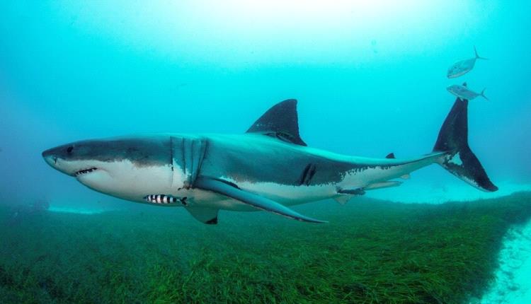 وأوضح أن القرش كان بصدد تناول جثة دلفين حيث ظهر بالفيديو سمكتا قرش أبيض.