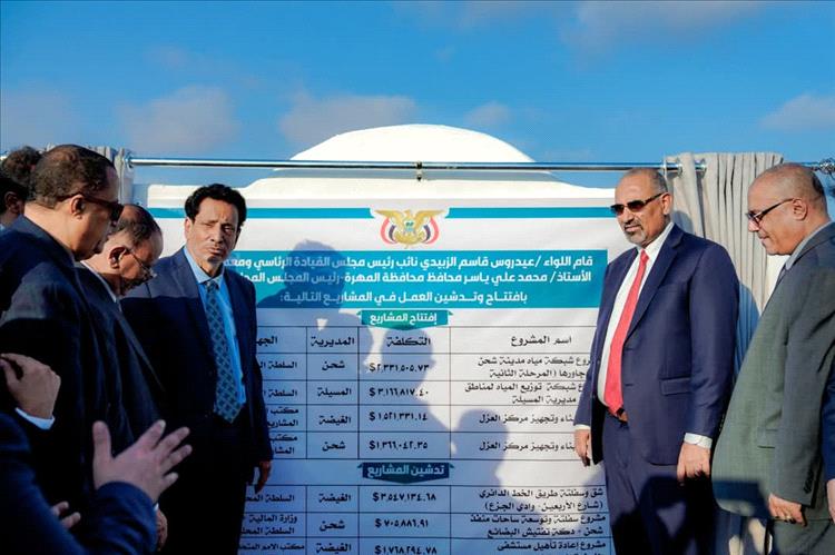 افتتح الرئيس القائد عيدروس قاسم الزُبيدي يرافقه محافظة المهرة محمد علي ياسر ووزراء الأشغال والخدمة المدنية، والنقل والشؤون الاجتماعية، والزراعة والثروة السمكية، والكهرباء، عددا من المشاريع الخدمية بمحافظة المهرة.