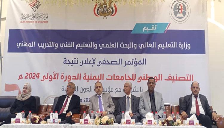 أعلنت وزارة التعليم العالي والبحث العلمي والتعليم الفني والتدريب المهني، اليوم، نتائج الدورة الأولى لتصنيف الجامعات اليمنية لعام 2024، خلال مؤتمر صحفي حضره الوزير الدكتور خالد أحمد الوصابي، إلى جانب عدد من قيادات الوزارة ورؤساء الجامعات وممثلي المؤسسات الأكاديمية.
