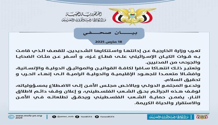 أصدرت وزارة الخارجية وشؤون المغتربين اليمنية بيان تعليقا على القصف الإسرائيلي لقطاع غزة.