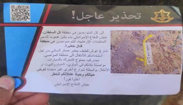 وتابع: «لا يُسمح لكم باستخدام المركبات، وأي محاولة للبقاء في مخيماتكم أو منازلكم، أو السير في مسارات غير مخصصة، ستعرض حياتكم وحياة أفراد عائلاتكم للخطر. غادروا فورًا حفاظًا على سلامتكم».