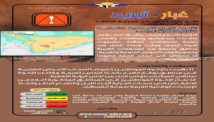 أكد مركز التنبؤات الجوية والإنذار المبكر في الهيئة العامة للطيران المدني والأرصاد، في نشرته التحذيرية الصادرة مساء اليوم لمدة 72 ساعة، أن مخرجات النماذج العددية المختلفة، وتحليل خرائط الطقس، تشير إلى نشاط الرياح السطحية الشمالية الشرقية..