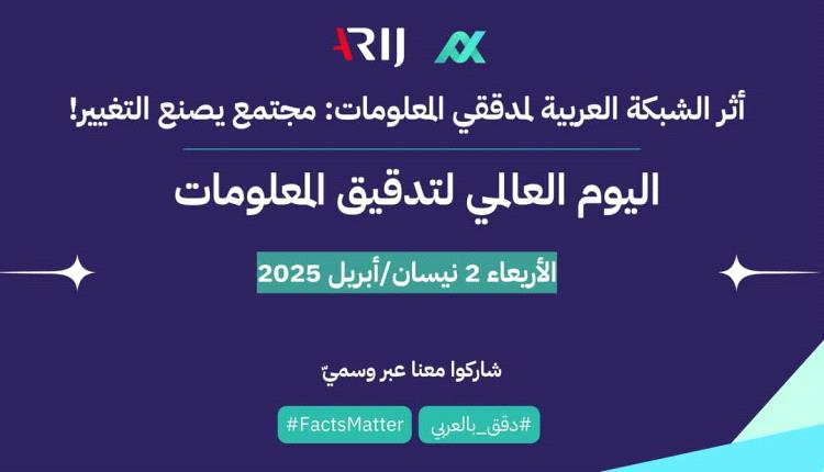 وتحت شعار "أثر الشبكة العربية لمدققي المعلومات: مجتمع يصنع التغيير!"، تنطلق حملة تستمر لمدة ثلاثة أيام، من 1 إلى 3 أبريل، بهدف تسليط الضوء على الأثر الحقيقي لتدقيق المعلومات في المجتمعات العربية.