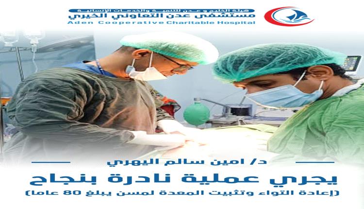 في إنجاز طبي نادر، نجح فريق جراحي متخصص في في مستشفى عدن التعاوني الخيري بإجراء عملية جراحية دقيقة لإنقاذ حياة مريض يبلغ من العمر 80 عامًا، كان يعاني من ألم شديد في المعدة، انتفاخ في البطن، وغثيان مستمر.
