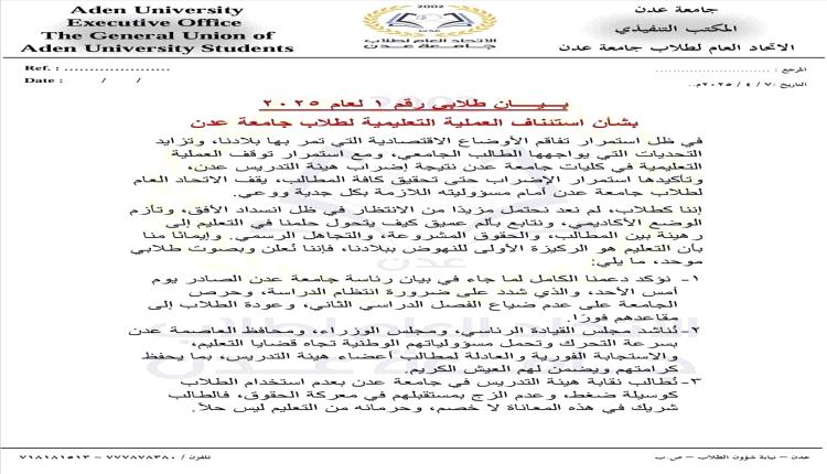 بـــيــــان طلابي رقم 1 لعام 2025 بشأن استئناف العملية التعليمية لطلاب جامعة عدن