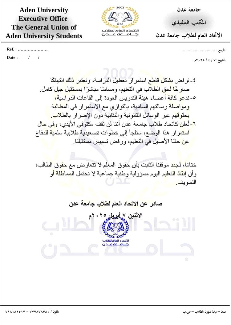 6. نُعلن كاتحاد طلاب جامعة عدن أننا لن نقف مكتوفي الأيدي، وفي حال استمرار هذا الوضع، سنلجأ إلى خطوات تصعيدية طلابية سلمية للدفاع عن حقنا الأصيل في التعليم، ورفض تسييس مستقبلنا.
