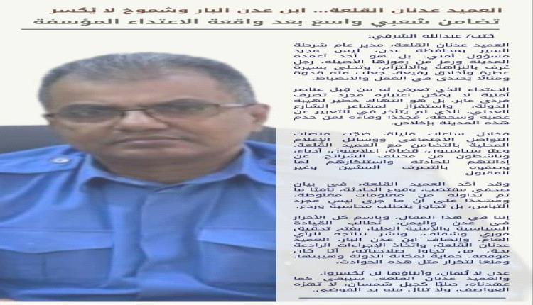 إننا في هذا المقال، وباسم كل الأحرار في عدن واليمن، نُطالب القيادة السياسية والأمنية العليا، بفتح تحقيق فوري وشفاف، ونشر نتائجه للرأي العام، وإنصاف ابن عدن البار، العميد عدنان القلعة، واتخاذ الإجراءات الرادعة بحق من تجاوز صلاحياته، أيًا كان موقعه، حمايةً لمكانة الدولة وهيبتها، ومنعًا لتكرار مثل هذه الحوادث.